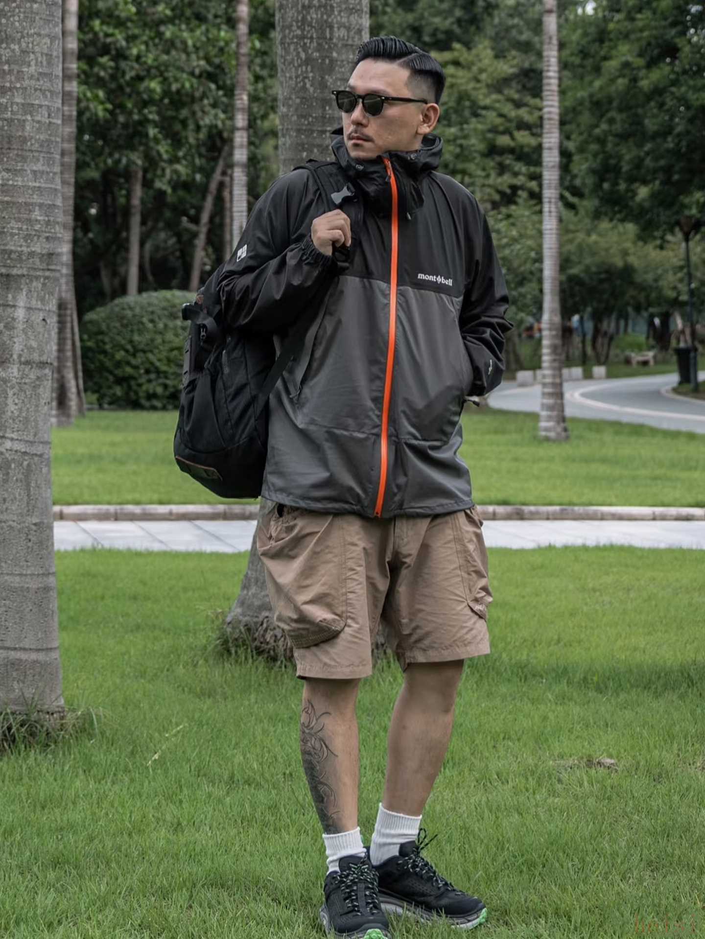 很多年輕人穿沖鋒衣時,都喜歡在下面搭配短褲,通過“上長下短”的穿法,來劃分身材比例,同時增加整體造型的時髦、年輕感。