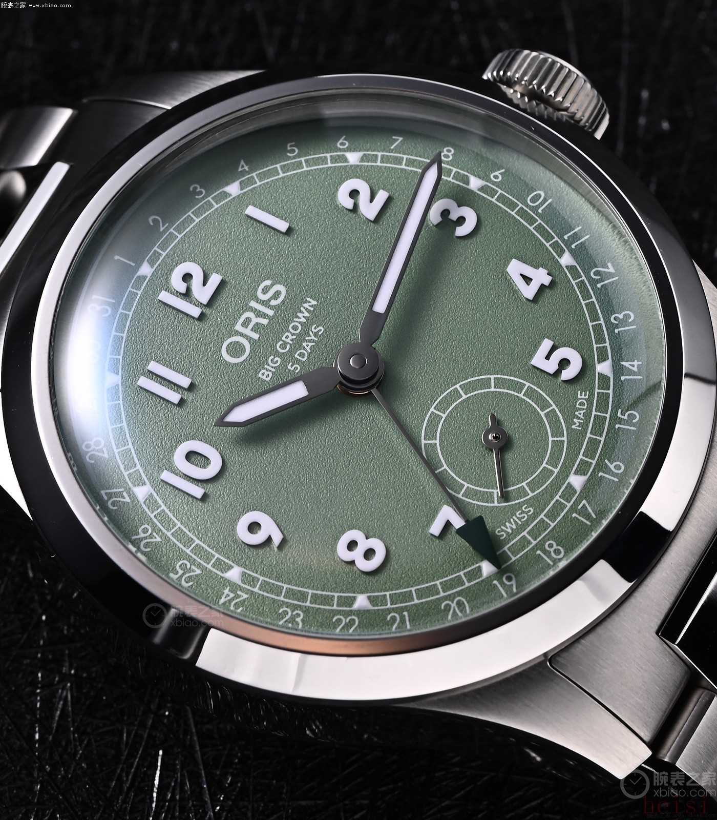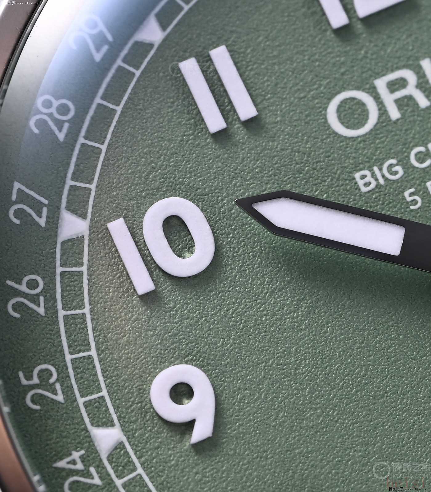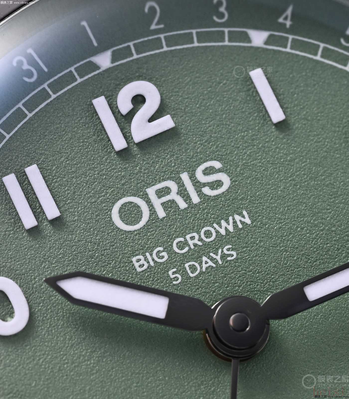 新款豪利時(shí)大表冠,第一個(gè)細(xì)節(jié),就是使用了立體的數(shù)字時(shí)標(biāo)。數(shù)字的立體感特別強(qiáng),而且所有數(shù)字都是夜光的。第二個(gè)盤面細(xì)節(jié)是,不論是綠盤、三文魚盤,盤面有明顯的顆粒感紋理裝飾,這種紋理要比一般的啞光盤面質(zhì)感強(qiáng)的多。向上隆起的藍(lán)寶石鏡面(泡泡鏡)進(jìn)一步增加了盤面效果,而在ORIS標(biāo)志下方的5 DAYS,表明了這只表擁有5天動(dòng)力,使用了豪利時(shí)400系列自產(chǎn)機(jī)芯。