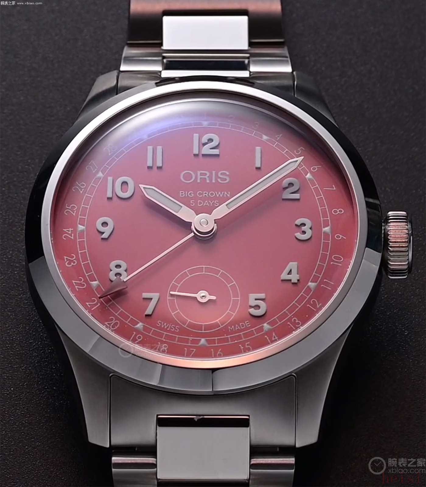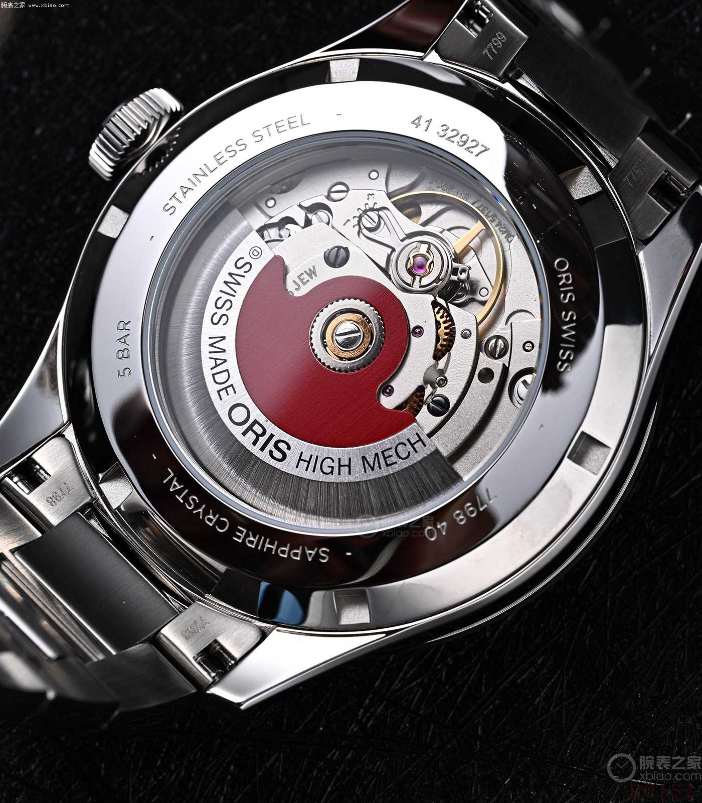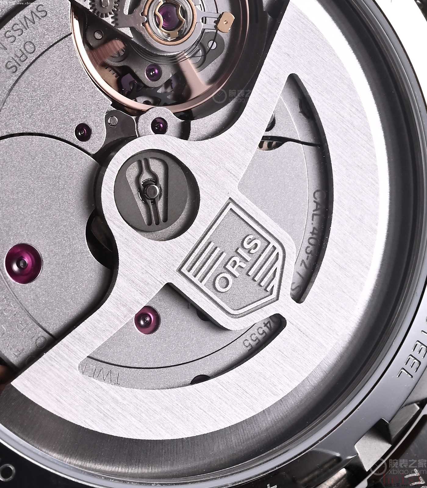 新款豪利時(shí)大表冠,第一個(gè)細(xì)節(jié),就是使用了立體的數(shù)字時(shí)標(biāo)。數(shù)字的立體感特別強(qiáng),而且所有數(shù)字都是夜光的。第二個(gè)盤面細(xì)節(jié)是,不論是綠盤、三文魚盤,盤面有明顯的顆粒感紋理裝飾,這種紋理要比一般的啞光盤面質(zhì)感強(qiáng)的多。向上隆起的藍(lán)寶石鏡面(泡泡鏡)進(jìn)一步增加了盤面效果,而在ORIS標(biāo)志下方的5 DAYS,表明了這只表擁有5天動(dòng)力,使用了豪利時(shí)400系列自產(chǎn)機(jī)芯。