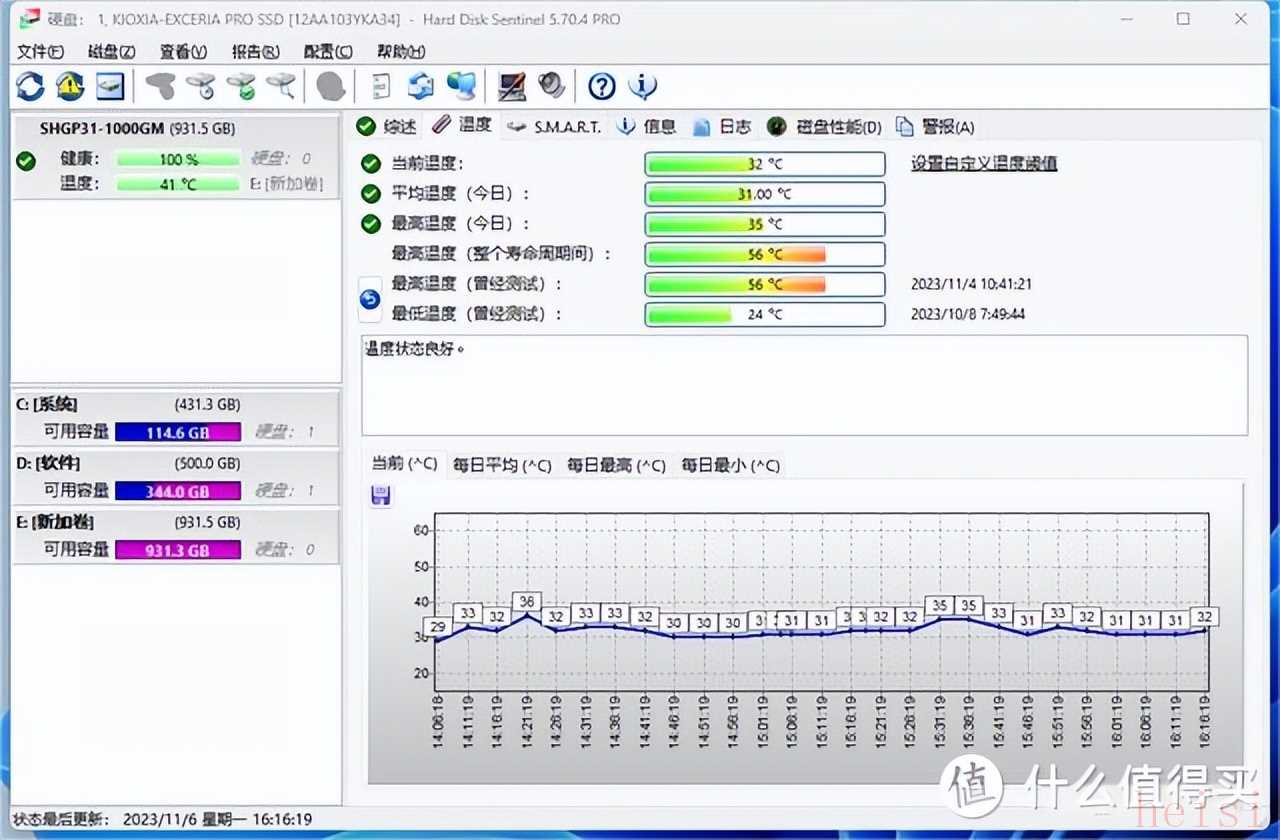 我用Hard Disk Sentinel這個工具來監(jiān)控溫度,發(fā)現(xiàn)我用的海力士P31固態(tài)硬盤,測試讀寫性能時的最高溫度可以達到56度。不過大多數(shù)時間,溫度都在31度左右,還算是挺涼快的。