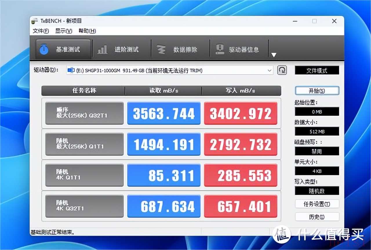 接著我用了另一個硬盤性能測試工具,TxBench。測試結(jié)果顯示,順序讀取速度是3563.744MB/s,順序?qū)懭胨俣葎t是3402.972MB/s,這個數(shù)據(jù)與CrystalDiskMark的結(jié)果基本一致,同樣遠超官方數(shù)據(jù),特別是寫入速度的表現(xiàn)讓我非常驚喜。