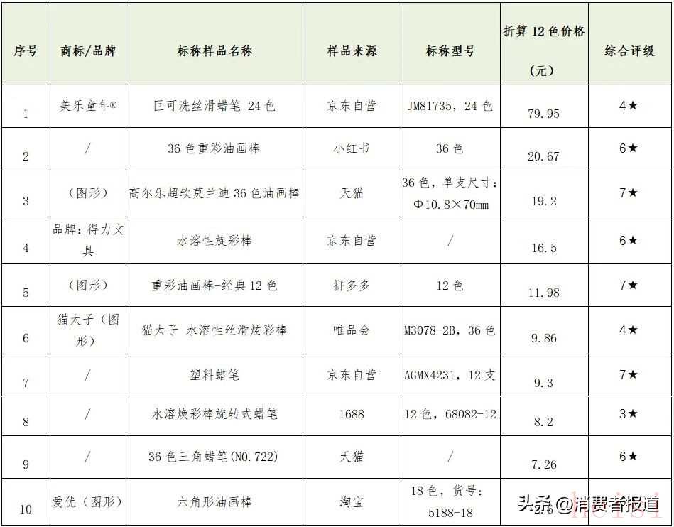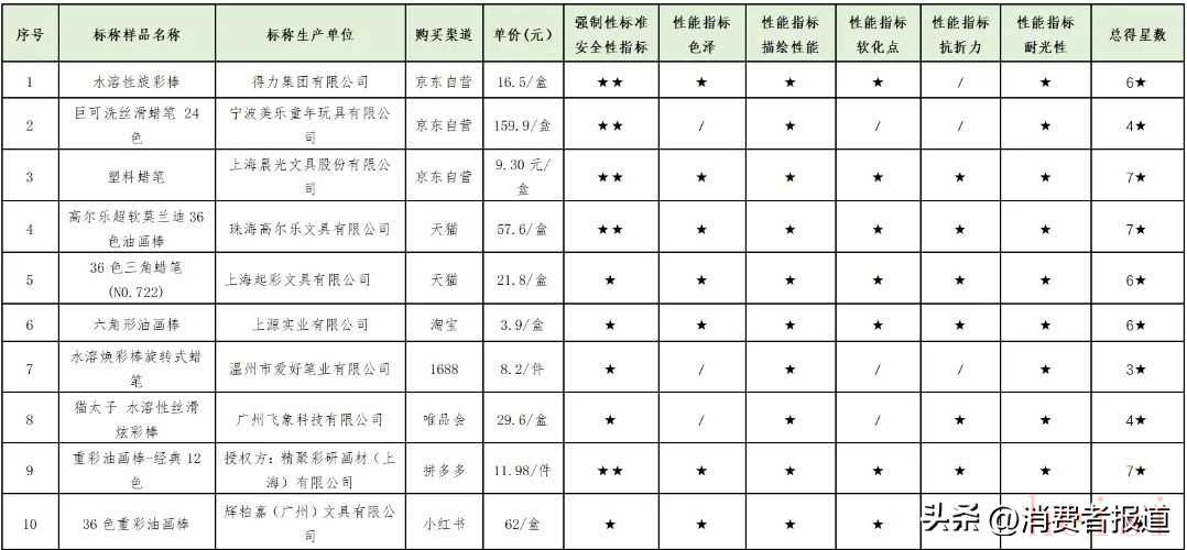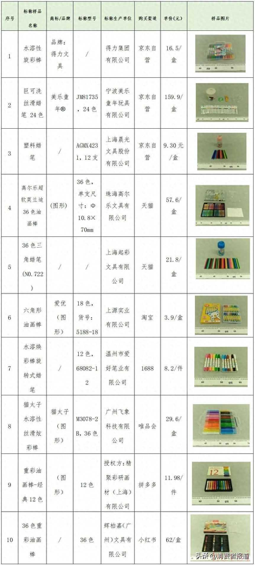 近日,青海省消費(fèi)者協(xié)會(huì)針對(duì)市場(chǎng)上銷售的10款蠟筆進(jìn)行了比較試驗(yàn),旨在為消費(fèi)者提供選購(gòu)參考。以下是試驗(yàn)報(bào)告的主要內(nèi)容: