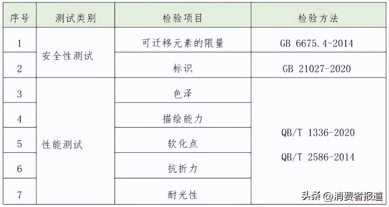 本次比較試驗(yàn)根據(jù)消費(fèi)者的關(guān)注點(diǎn)、產(chǎn)品的風(fēng)險(xiǎn)點(diǎn)、相關(guān)產(chǎn)品國(guó)家安全標(biāo)準(zhǔn)要求等確定測(cè)評(píng)項(xiàng)目。測(cè)評(píng)項(xiàng)目包括兩類:一是蠟筆的安全性,參照我國(guó)學(xué)生文具強(qiáng)制性國(guó)家標(biāo)準(zhǔn)GB 21027-2020《學(xué)生用品的安全通用要求》;二是功能性及使用性能測(cè)試,參照產(chǎn)品推薦性行業(yè)標(biāo)準(zhǔn)QB/T 1336-2020《蠟筆》、QB/T 2586-2014《油畫棒》。測(cè)評(píng)項(xiàng)目見(jiàn)表2。