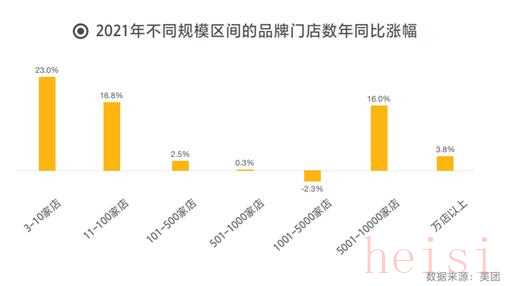 2021年不同規(guī)模區(qū)間的品牌門店數(shù)年同比漲幅