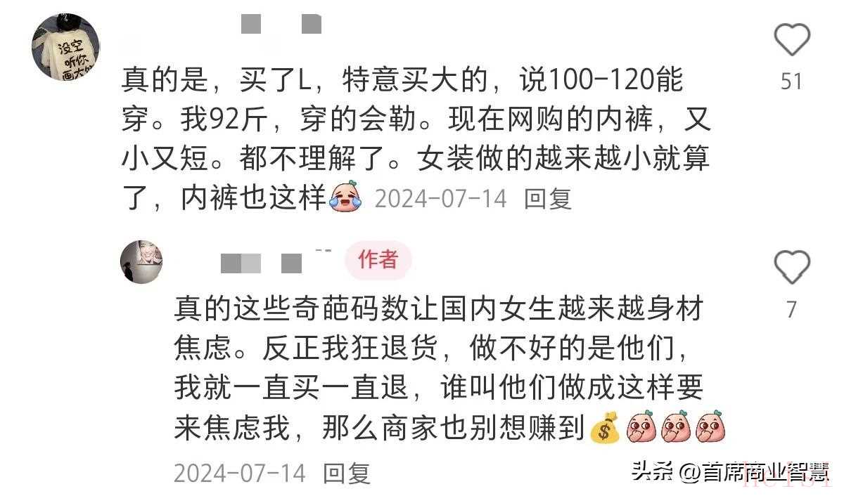 尺碼“通脹”已經變成了“一分錢”不“一分貨”了,女裝內褲也算女裝,逐漸也被同化收納,和女裝尺碼越做越小一樣,女士內褲也開始染上了壞風氣。