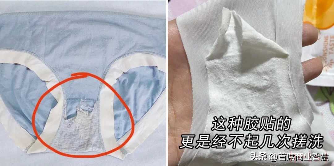 有消費者花很多錢購入內褲,結果底襠純棉布是用膠粘在褲身上的,洗一次膠開了,如果按著3條136元,接近40多元一條,按3個月一換的頻率,一年光內褲支出就超1000元!