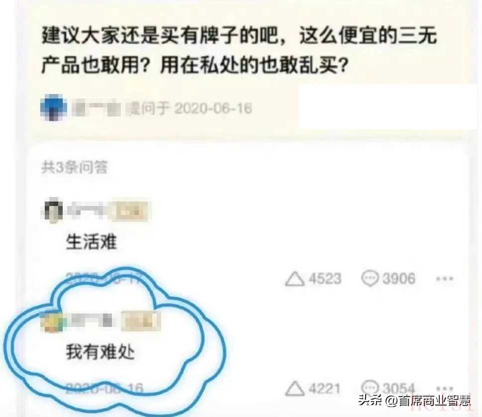 也許很多女性消費者都忘不掉那張截圖,一個賣散裝衛(wèi)生巾店鋪的評論下有人問:這也敢亂買?這么便宜不怕質量有問題?有人寫下回復:“我有難處?!?/span>只是四個字,很多人唏噓到現在。