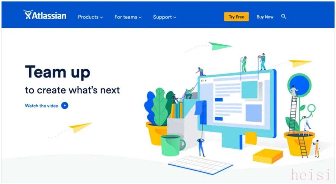 Atlassian用配色明快的圖形插畫描繪了齊心協(xié)力的工作場景,烘托出“Team up”的產(chǎn)品價值主張: