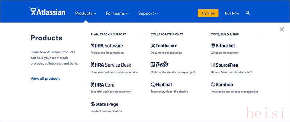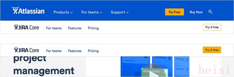 再看看Atlassian的設(shè)計。到達子產(chǎn)品頁后會保留主導(dǎo)航,隨著頁面滾動,子產(chǎn)品導(dǎo)航會把主導(dǎo)航推出,繼而代替主導(dǎo)航的位置: