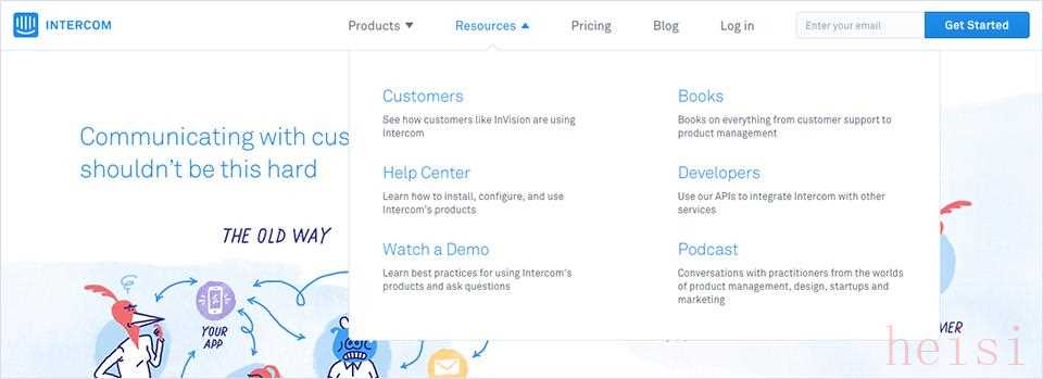 在Resource下拉菜單中則收攏了客戶案例、幫助中心、產(chǎn)品演示等資源入口,用清晰的組織方式把這些信息集中在一起,讓想要了解更多信息的人自己去探索: