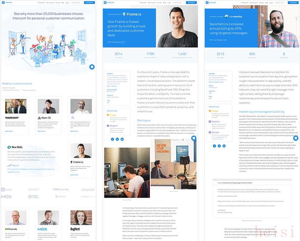 Intercom在客戶故事這方面下足了功夫,每個重點客戶都有內(nèi)容豐富的專題頁,里面有客戶公司簡介,描述了用Intercom的哪些產(chǎn)品解決了哪些問題,有從他們產(chǎn)品角度出發(fā)的第三人稱描述,也有客戶的第一人稱陳述: