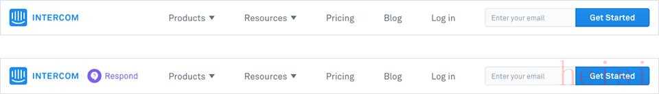 繼續(xù)以Intercom為例,首頁導(dǎo)航在滾動時保持常駐。當(dāng)點擊首頁導(dǎo)航到達子產(chǎn)品頁面后,導(dǎo)航保持一致,只是在原先的主LOGO旁多了一個子產(chǎn)品LOGO來表明當(dāng)前所在頁面,點擊主LOGO可以返回首頁:
