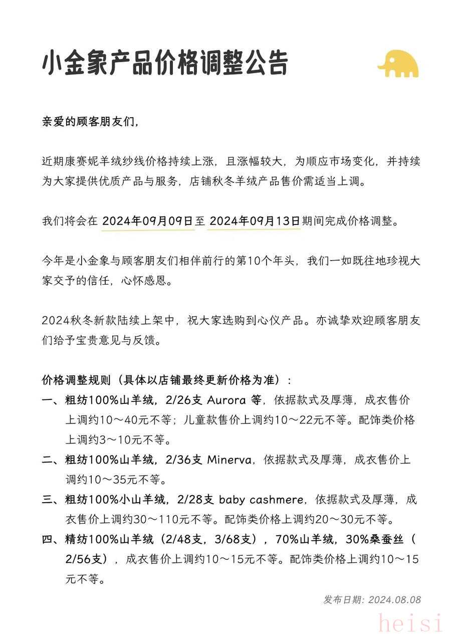 小金象羊絨今年8月發(fā)布的價格調(diào)整公告。(圖片由品牌淘寶店鋪客服提供)