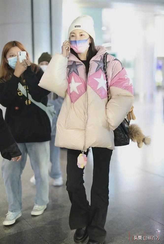 張雨綺以黑色個(gè)性的造型搭配粉色羽絨外套。