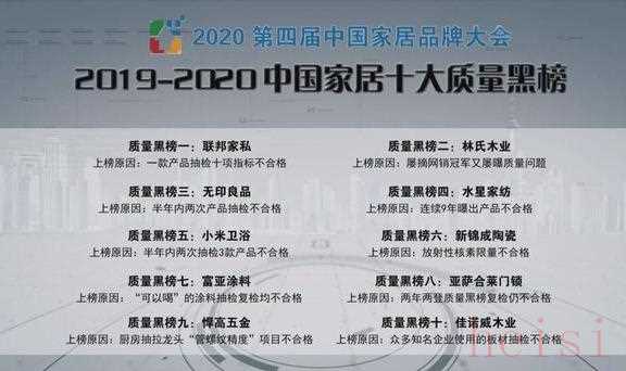 8月28日,第四屆中國(guó)家居品牌大會(huì)在蘇州舉行,會(huì)上發(fā)布了“2019-2020中國(guó)家居十大質(zhì)量黑榜”,聯(lián)邦家私、林氏木業(yè)、無印良品、水星家紡、小米衛(wèi)浴、新錦成陶瓷、富亞涂料、亞薩合萊門鎖、悍高五金、佳諾威木業(yè)十家公司登上黑榜。
