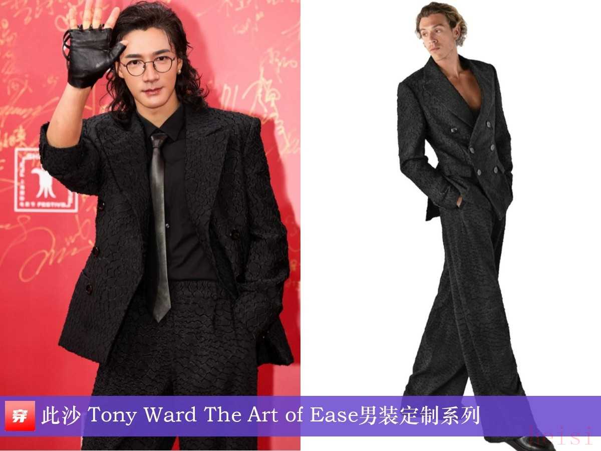 身穿Tony Ward The Art of Ease男裝定制系列黑色立體提花雙排扣西服套裝亮相第27屆上海國(guó)際電影節(jié)開(kāi)幕式的此沙。