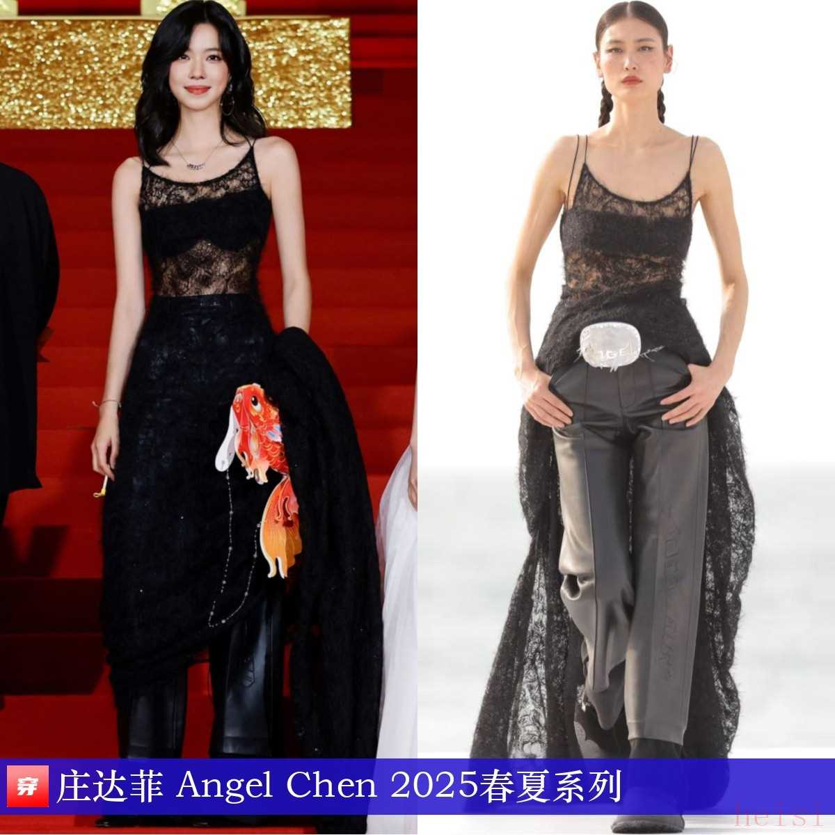 亮相第27屆上海國(guó)際電影節(jié)開(kāi)幕式紅毯的莊達(dá)菲穿了一套來(lái)自Angel Chen 2025春夏系列的黑色蕾絲拖尾吊帶上衣。