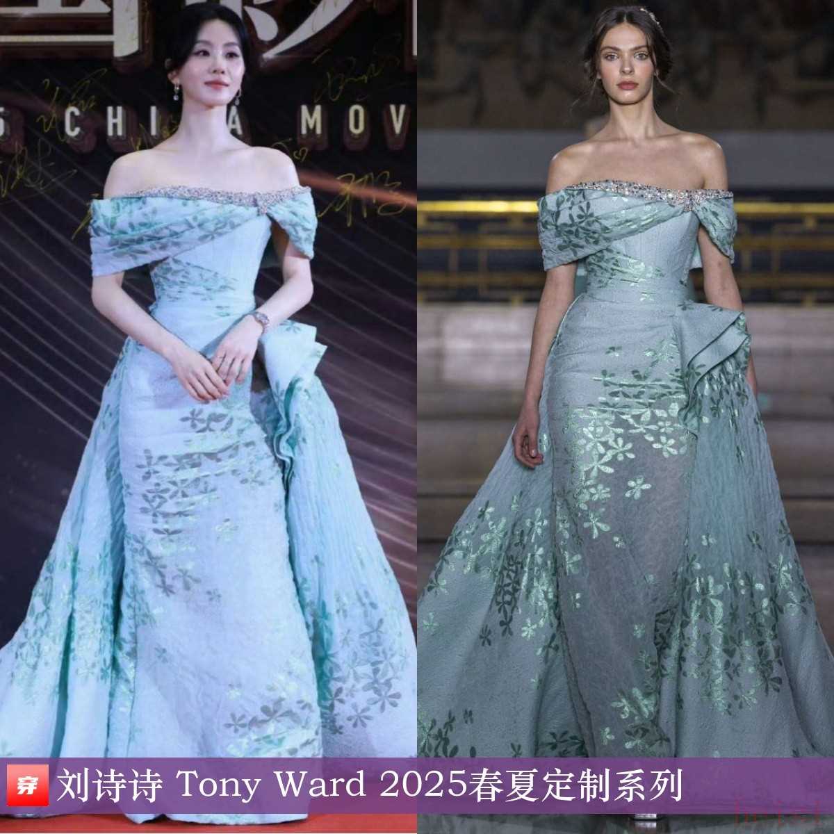劉詩(shī)詩(shī)亮相2025中國(guó)影視之夜紅毯,她穿的藍(lán)色刺繡拖尾一字肩禮服來(lái)自Tony Ward 2025春夏定制系列。
