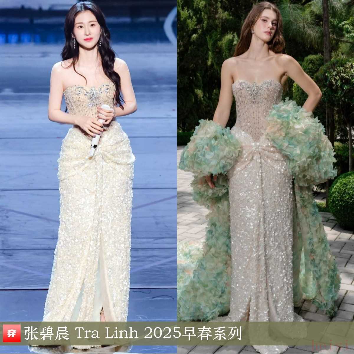 張碧晨身穿來(lái)自Tra Linh 2025早春系列的釘珠亮片抹胸禮服亮相2025微博電影之夜內(nèi)場(chǎng)活動(dòng)。