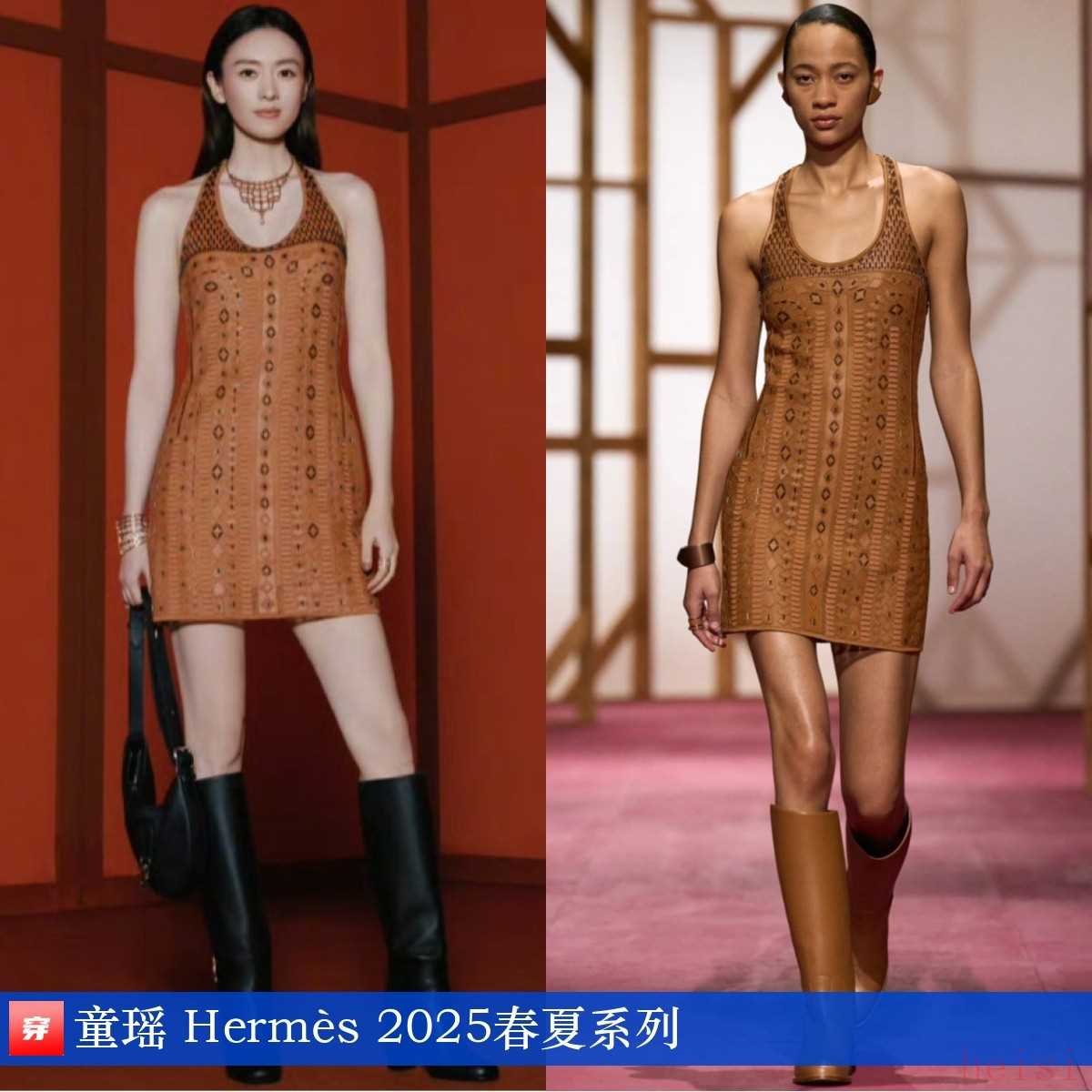 觀看Hermès 2025秋冬秀,童瑤穿了一套來(lái)自Hermès 2025春夏系列的深橙色提花拼接背心連衣裙。