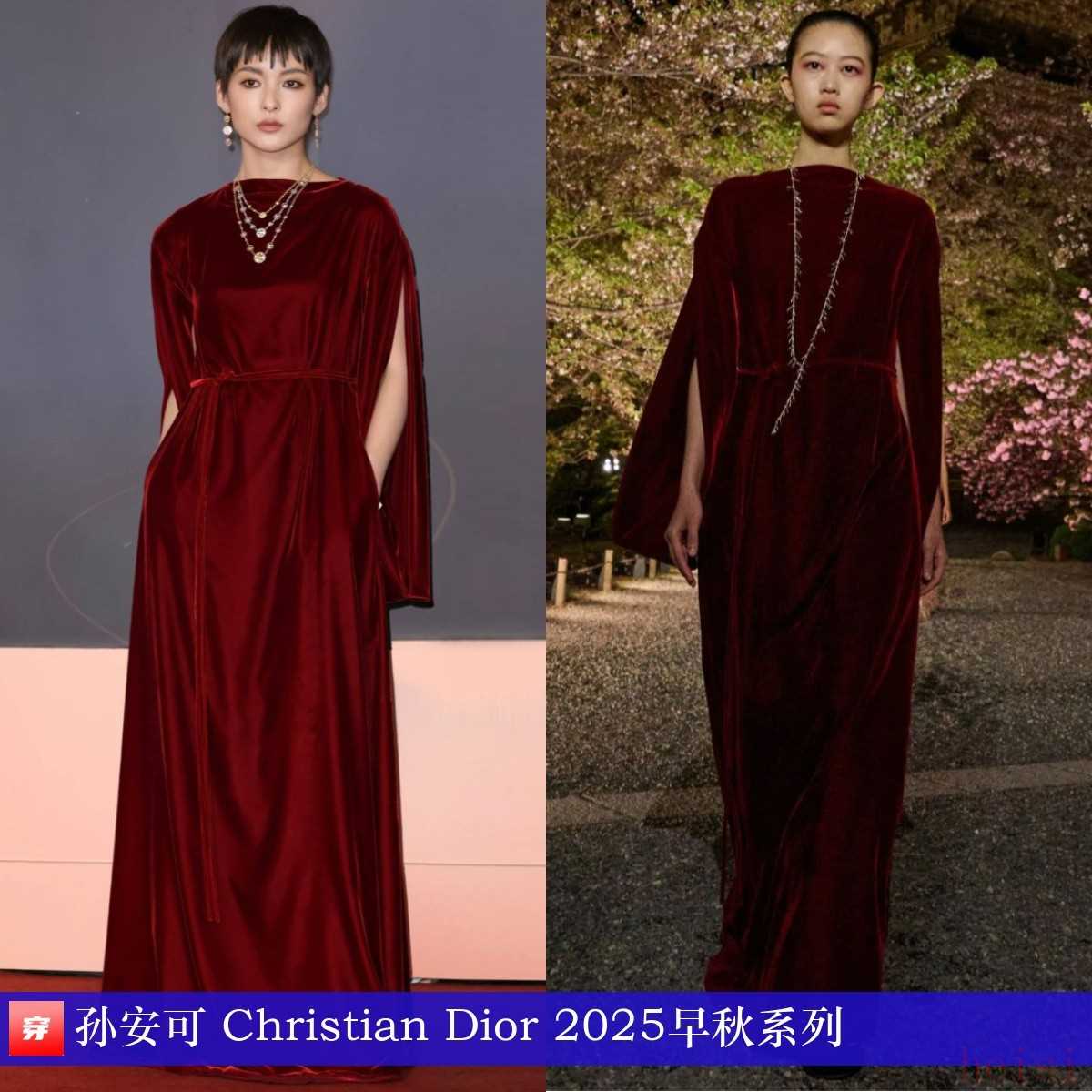 2025微博電影之夜紅毯上的孫安可,身穿Christian Dior 2025早秋系列的酒紅色斗篷袖絲絨連衣裙。