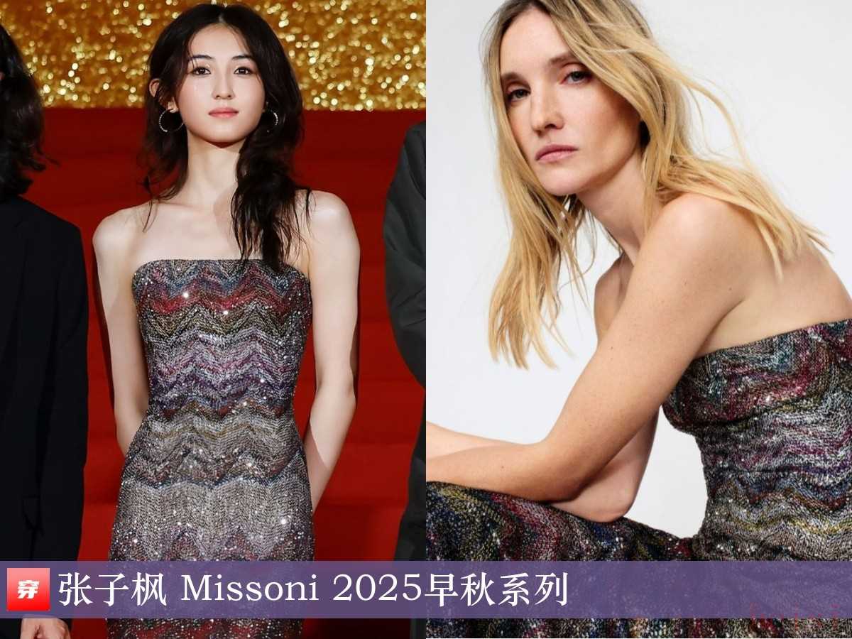 第27屆上海國(guó)際電影節(jié)開(kāi)幕式上的張子楓,漸變亮片紋理抹胸連衣裙:Missoni 2025早秋系列。