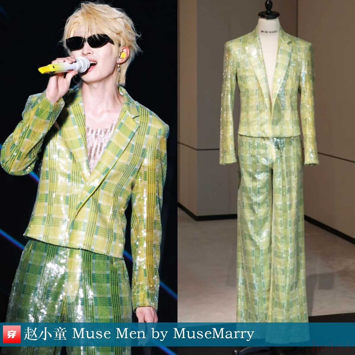 趙小童在「等枝椏成繁花」2025十個(gè)勤天巡回演唱會(huì)深圳站中,穿的黃綠亮片格紋西裝來(lái)自Muse Men by MuseMarry。
