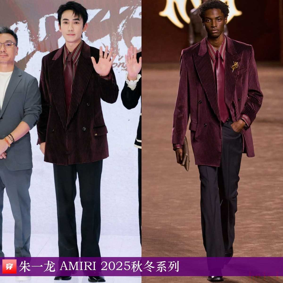 亮相2025電影奇遇夜的朱一龍這次選擇了一套來(lái)自AMIRI 2025秋冬系列的紅白條紋襯衣、酒紅色燈芯絨條紋西裝。