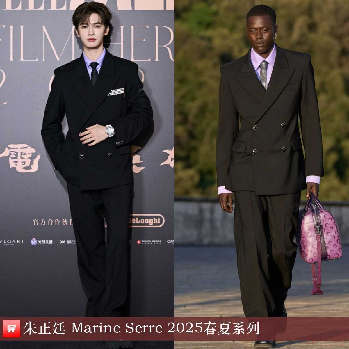 朱正廷參加第27屆上海國(guó)際電影節(jié)開(kāi)幕晚宴暨ELLEMEN電影英雄之夜活動(dòng),穿的黑色戧駁領(lǐng)雙排扣西裝來(lái)自Marine Serre 2025春夏系列。