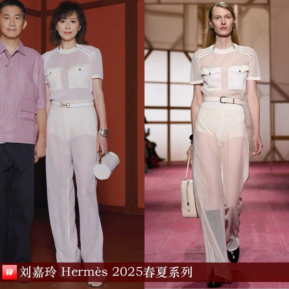 劉嘉玲參加了在上海舉行的Hermès 2025秋冬秀,白色短袖襯衣、透視闊腿褲來(lái)自Hermès 2025春夏系列。