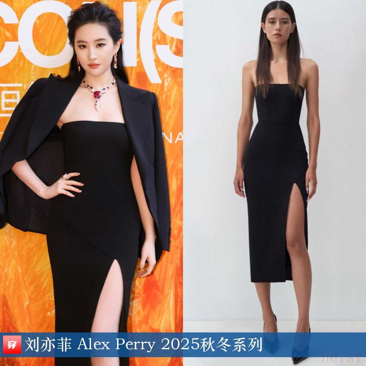 劉亦菲在《永恒符號(hào)》首映禮上穿的黑色高叉抹胸裙來(lái)自Alex Perry 2025秋冬系列。