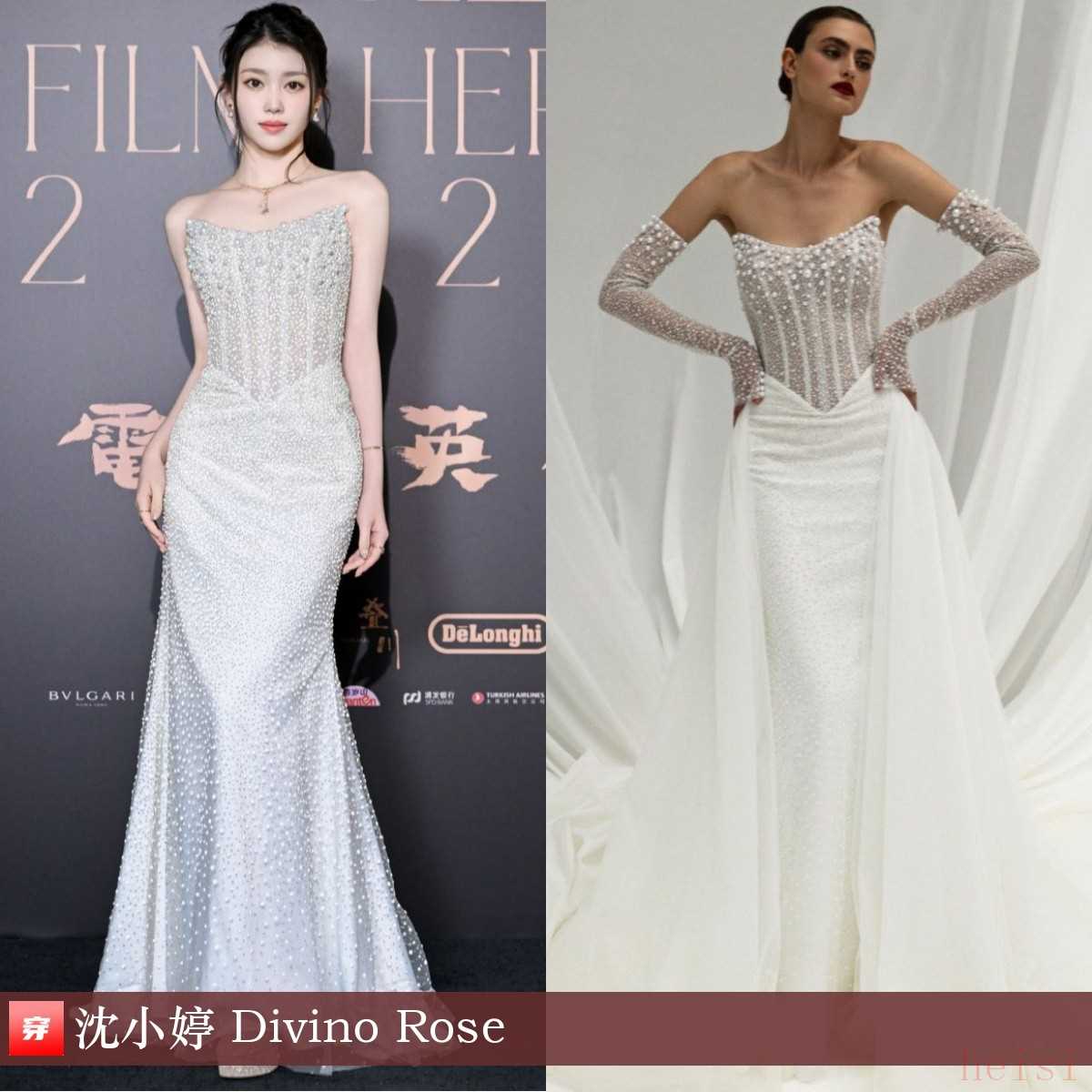 第27屆上海國(guó)際電影節(jié)開(kāi)幕晚宴暨ELLEMEN電影英雄之夜上的沈小婷,身穿Divino Rose的白色釘珠拼接抹胸禮服。