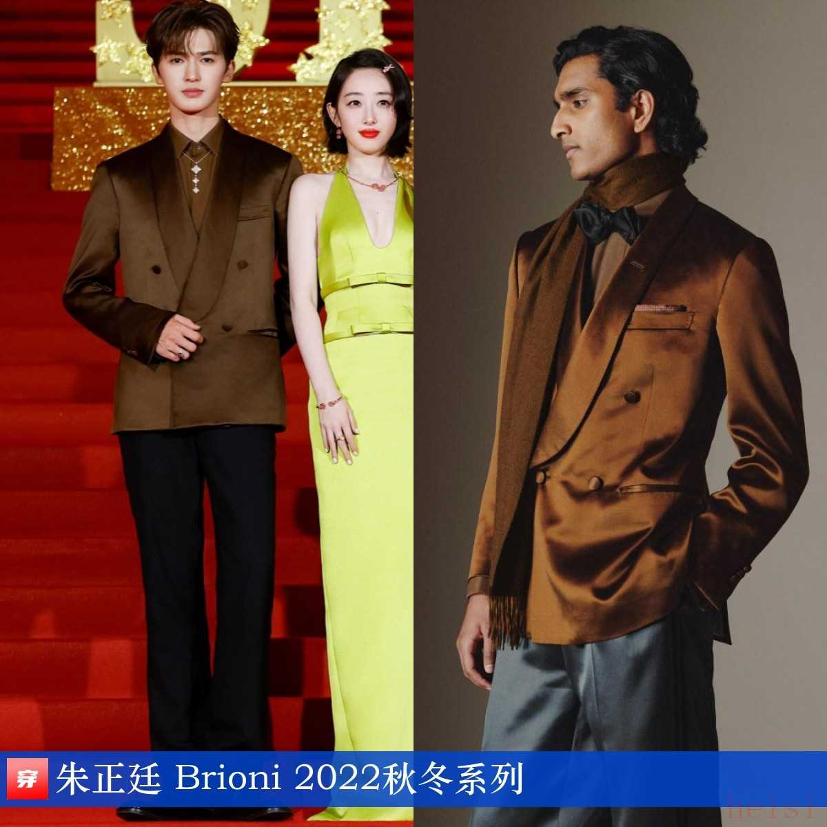朱正廷參加第27屆上海國(guó)際電影節(jié)開(kāi)幕式,棕色緞面雙排扣西裝來(lái)自Brioni 2022秋冬系列。