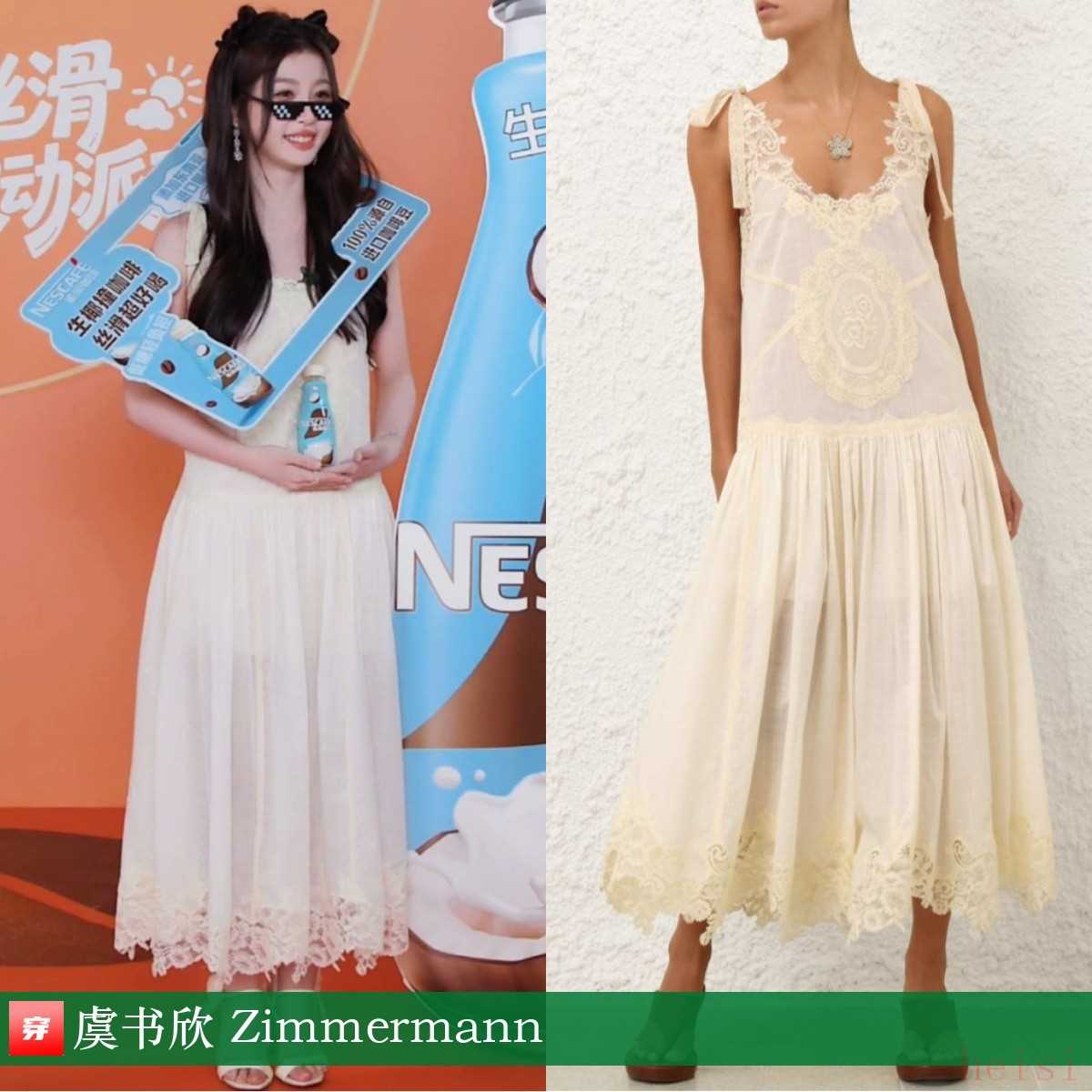 虞書欣身穿來(lái)自Zimmermann的米色刺繡蕾絲連衣裙亮相品牌某直播活動(dòng)。