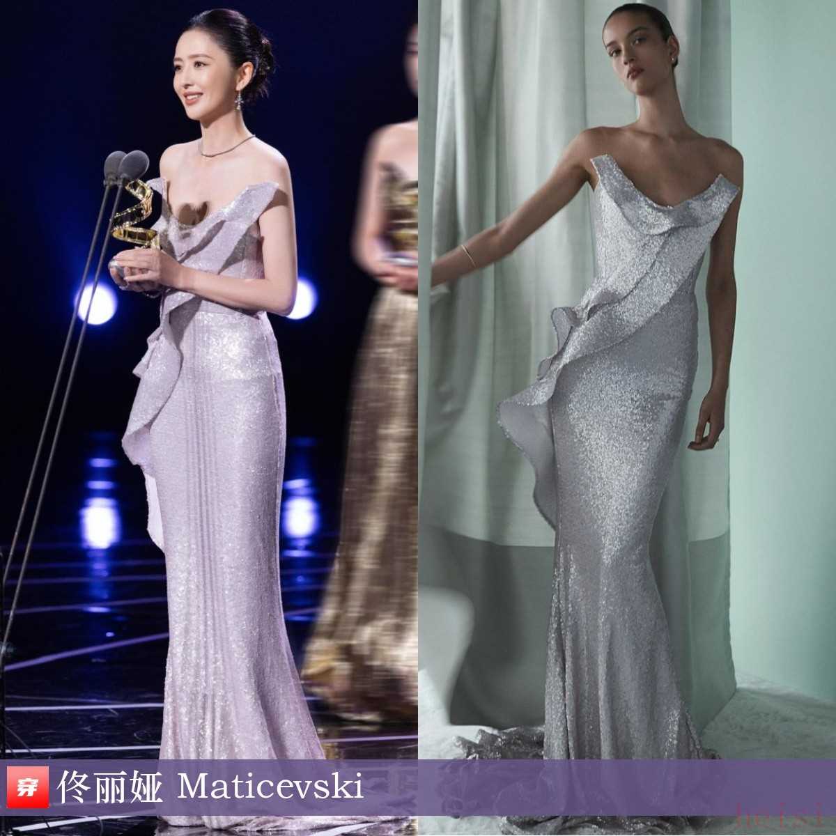 佟麗婭身穿來(lái)自Maticevski的銀色折疊荷葉邊抹胸禮服亮相2025微博電影之夜內(nèi)場(chǎng)頒獎(jiǎng)活動(dòng)。