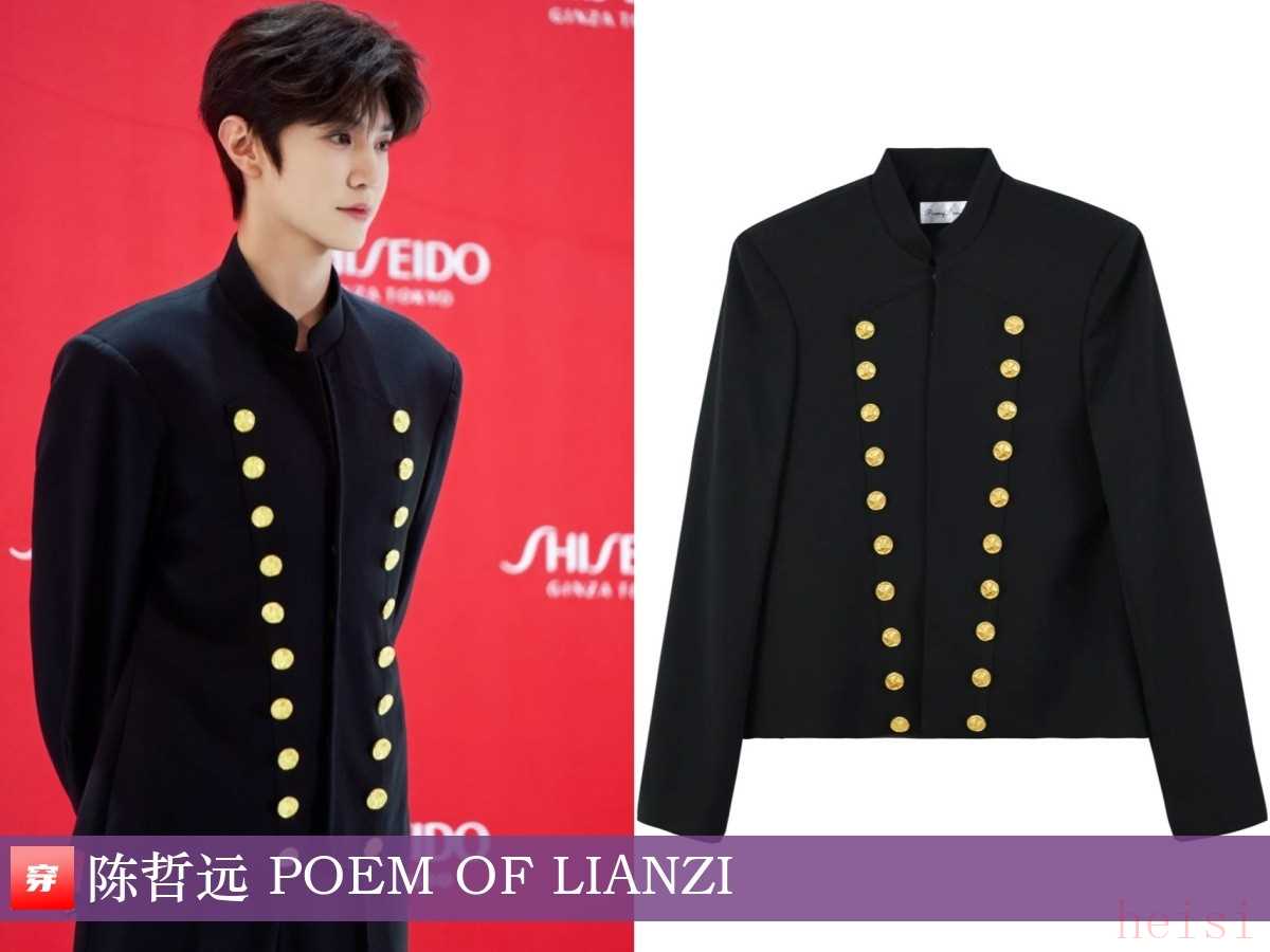 陳哲遠(yuǎn)在西安參加某品牌活動(dòng),金色雙排扣黑色立領(lǐng)夾克來(lái)自POEM OF LIANZI。
