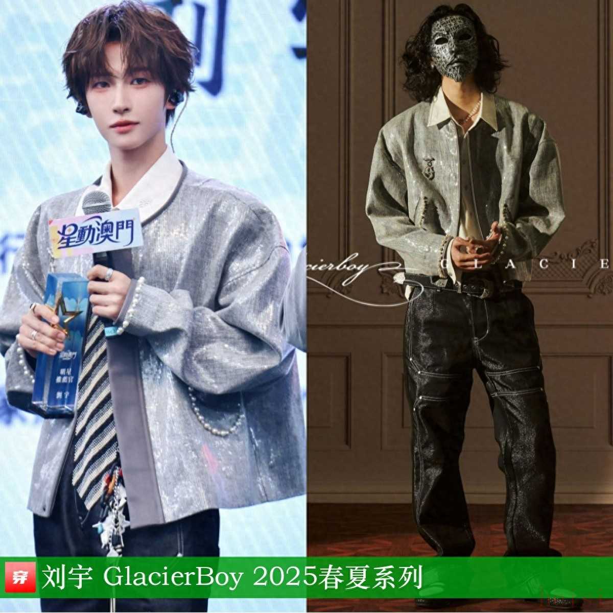 在“星動(dòng)澳門”嘉年華活動(dòng)中,劉宇穿了一套來(lái)自GlacierBoy 2025春夏系列的珍珠裝飾銀色亮片短款?yuàn)A克。