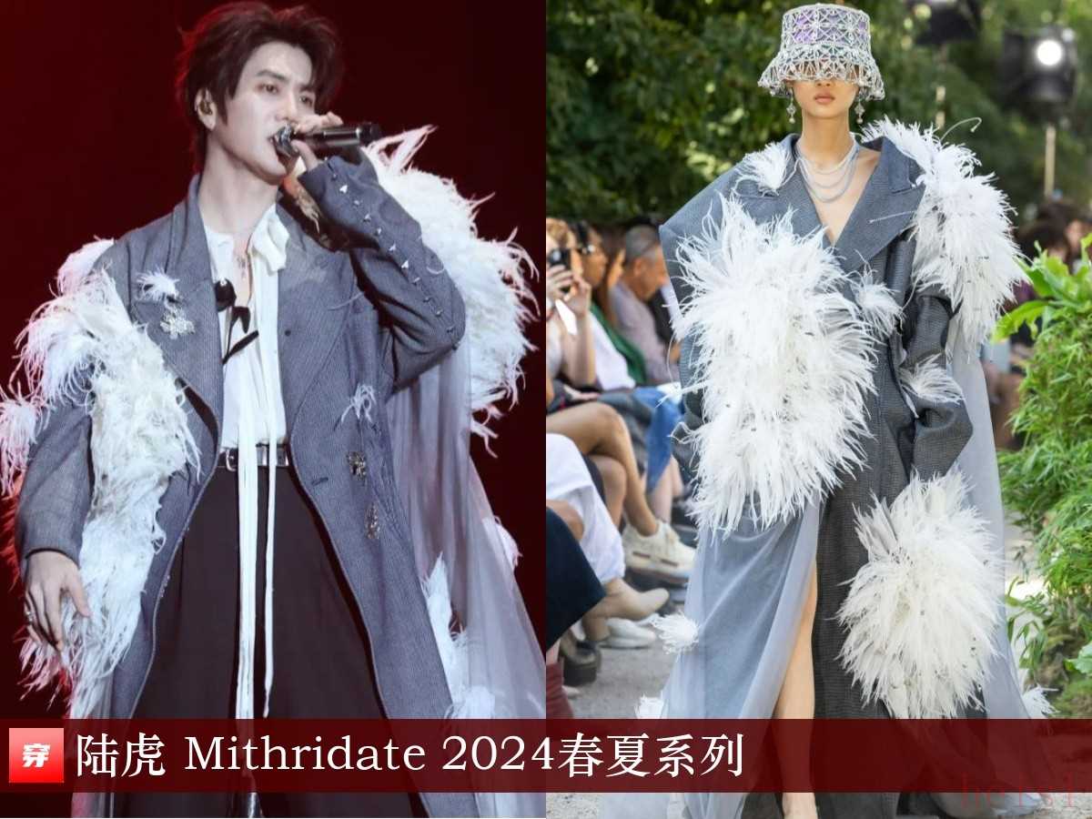 陸虎在自己的「像你這樣的朋友2.0」巡演廣州站上,穿了一套來自Mithridate 2024春夏系列的白色羽毛裝飾灰色超長款大衣。