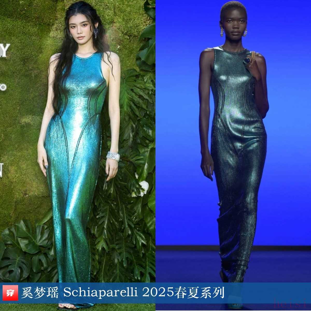 奚夢瑤亮相在三亞舉行的Vogue Vacation潮汐紅毯,金屬光澤挖肩連衣裙來自Schiaparelli 2025春夏系列。