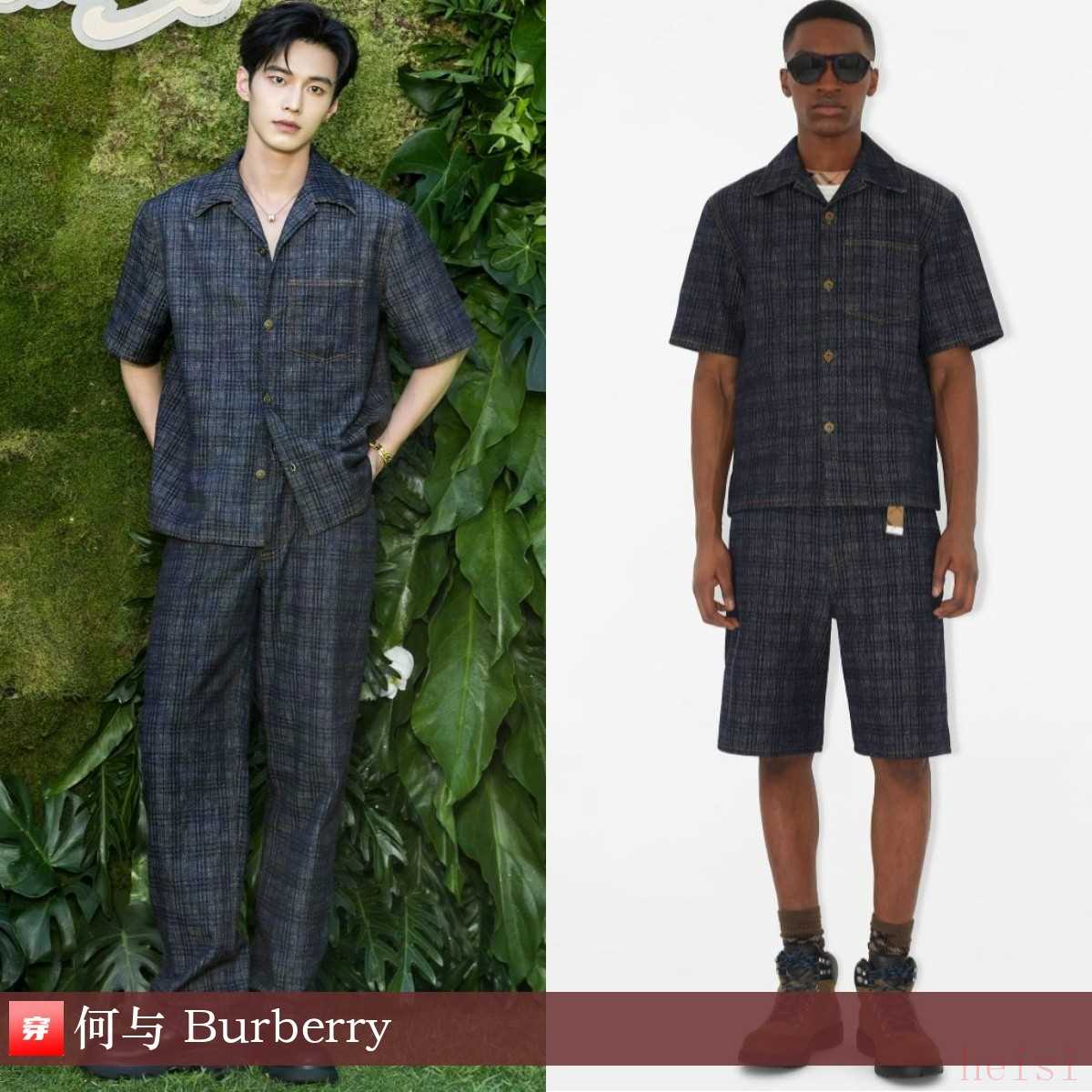 依然來自Vogue Vacation潮汐紅毯活動,何與穿了一套來自Burberry的深灰色格紋牛仔襯衫。