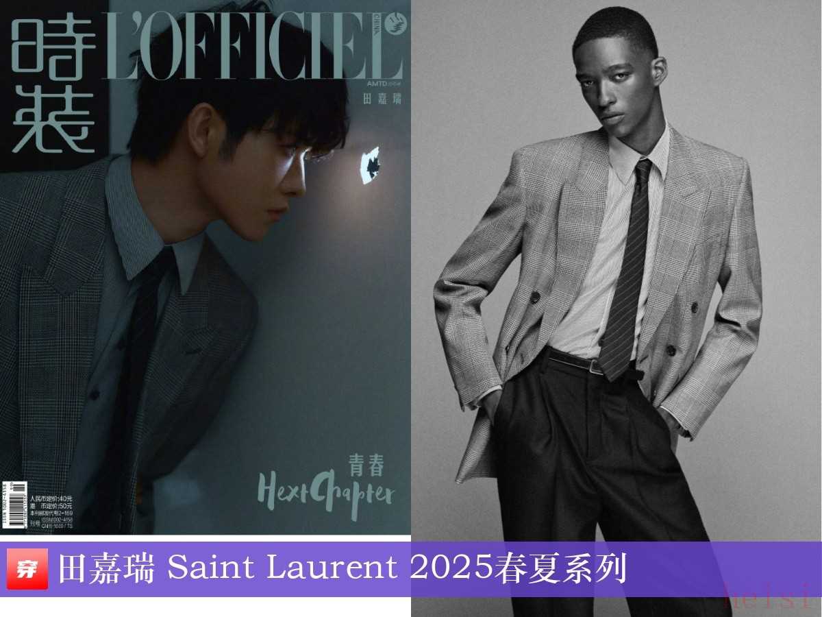 田嘉瑞,在《時裝》2025年6月增刊封面上穿的灰色雙排扣格紋西裝來自Saint Laurent 2025春夏系列。