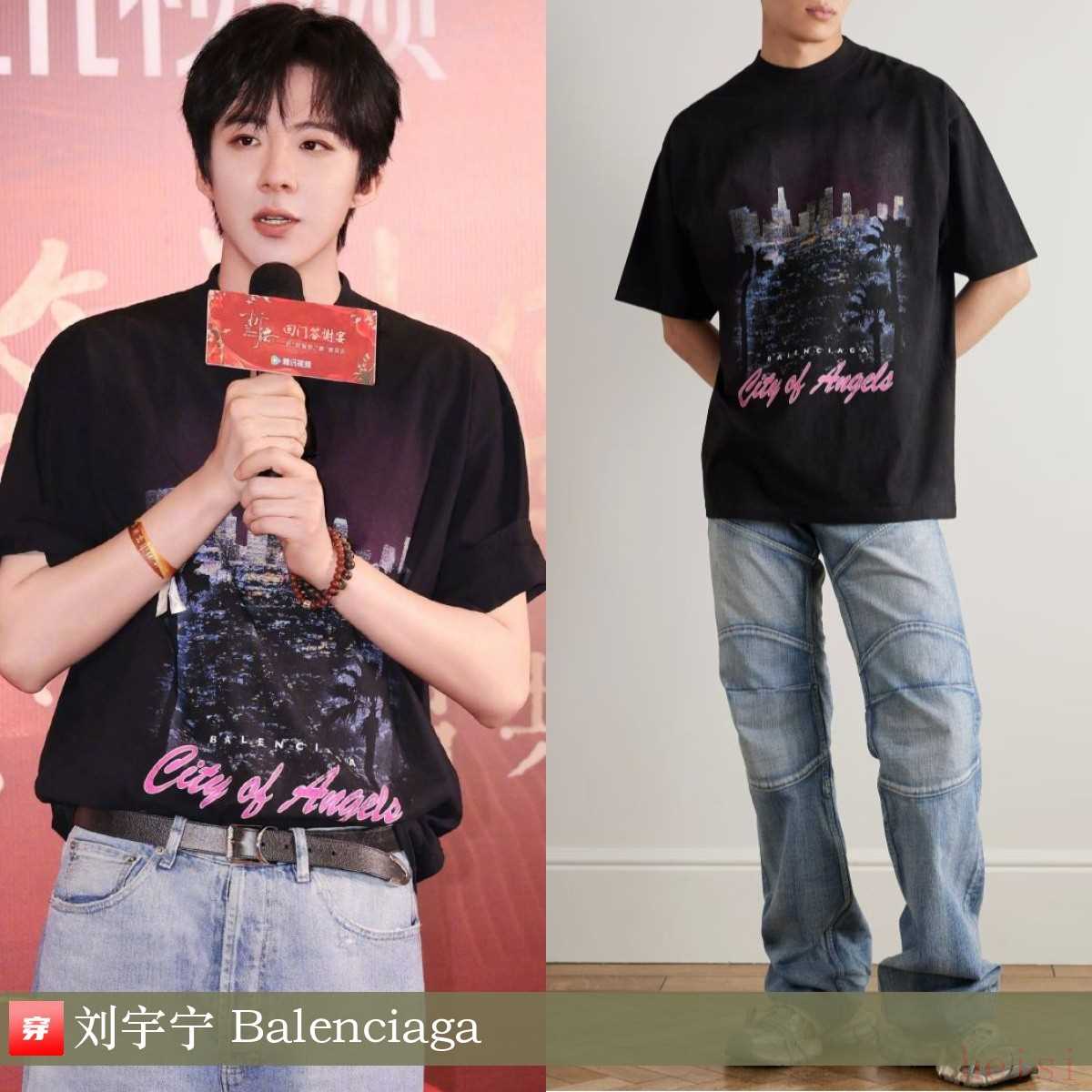 劉宇寧參加了《折腰》的慶功宴,黑色印花T恤來自Balenciaga。
