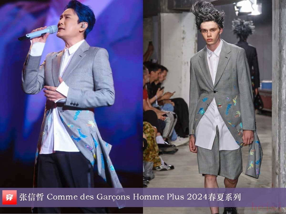張信哲擔任了張遠「白」巡回演唱會佛山站的嘉賓,他穿的灰色刺繡格紋西裝來自Comme des Gar?ons Homme Plus 2024春夏系列。