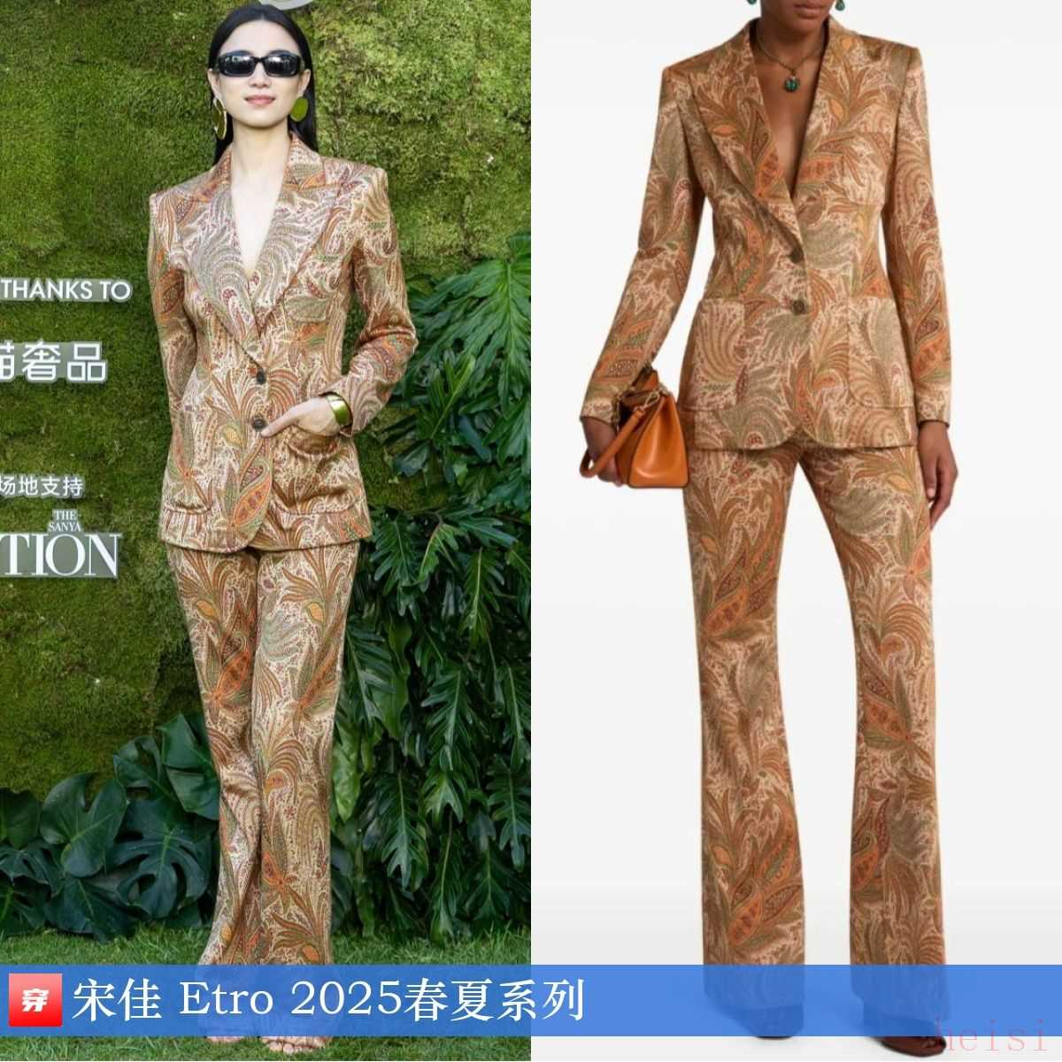宋佳亮相Vogue Vacation潮汐紅毯,淺橘色提花西服套裝來自Etro 2025春夏系列。