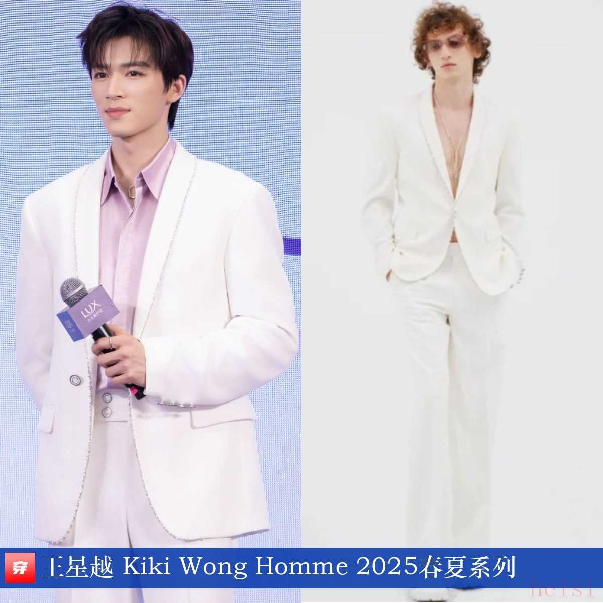 在某品牌的活動上,王星越身穿Kiki Wong Homme 2025春夏系列的鉆飾邊白色西服套裝。