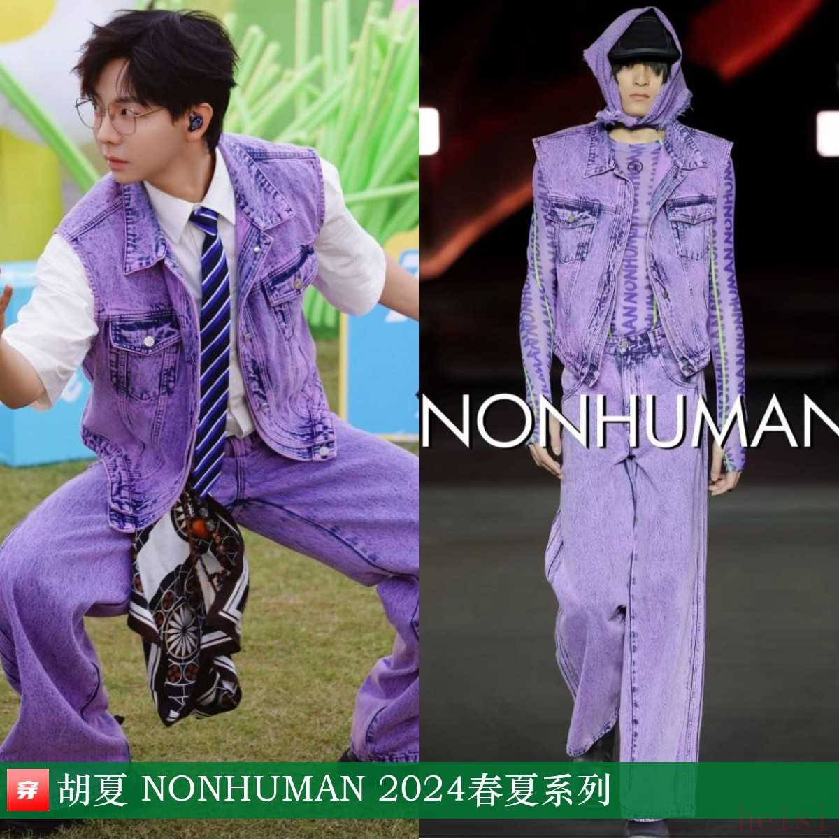 胡夏在央視的綜藝《樂在旅途》里面穿的紫色牛仔馬甲、牛仔褲來自NONHUMAN 2024春夏系列。