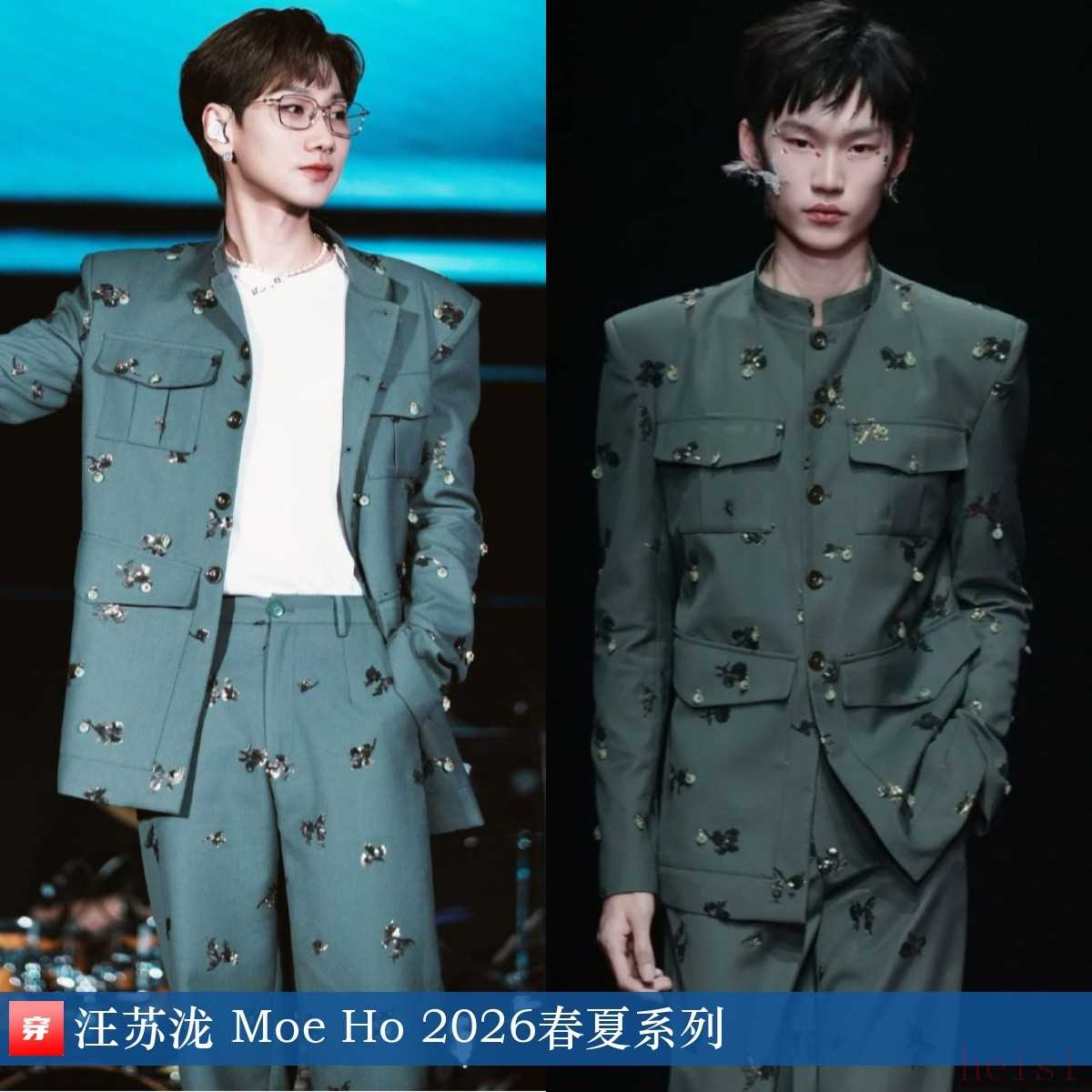 汪蘇瀧身穿來自Moe Ho 2026春夏系列的灰綠色墜飾中式立領套裝亮相太空奇緣城市音樂派對武漢站。