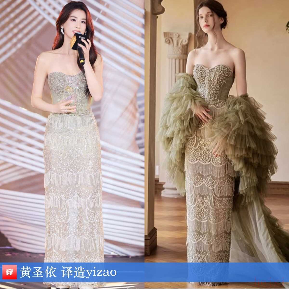 身穿譯造yizao銀色釘珠流蘇抹胸禮服亮相費加羅herself之夜內場的黃圣依。