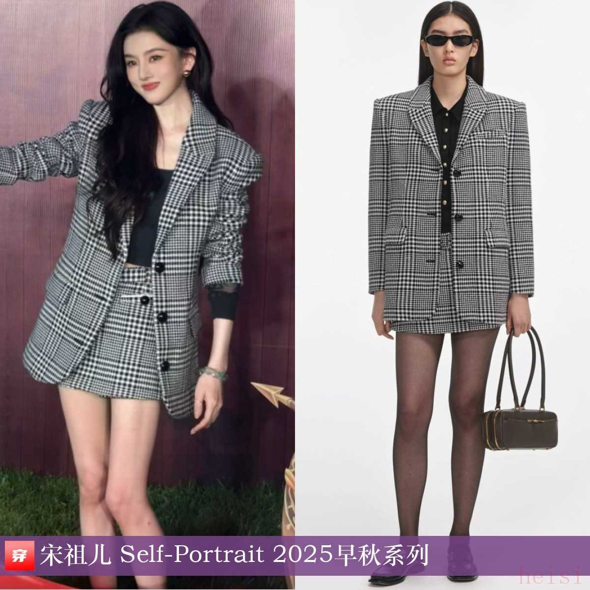 在《折腰》慶功宴上,宋祖兒穿了一套來自Self-Portrait 2025早秋系列的灰色千鳥格西服、短裙套裝。