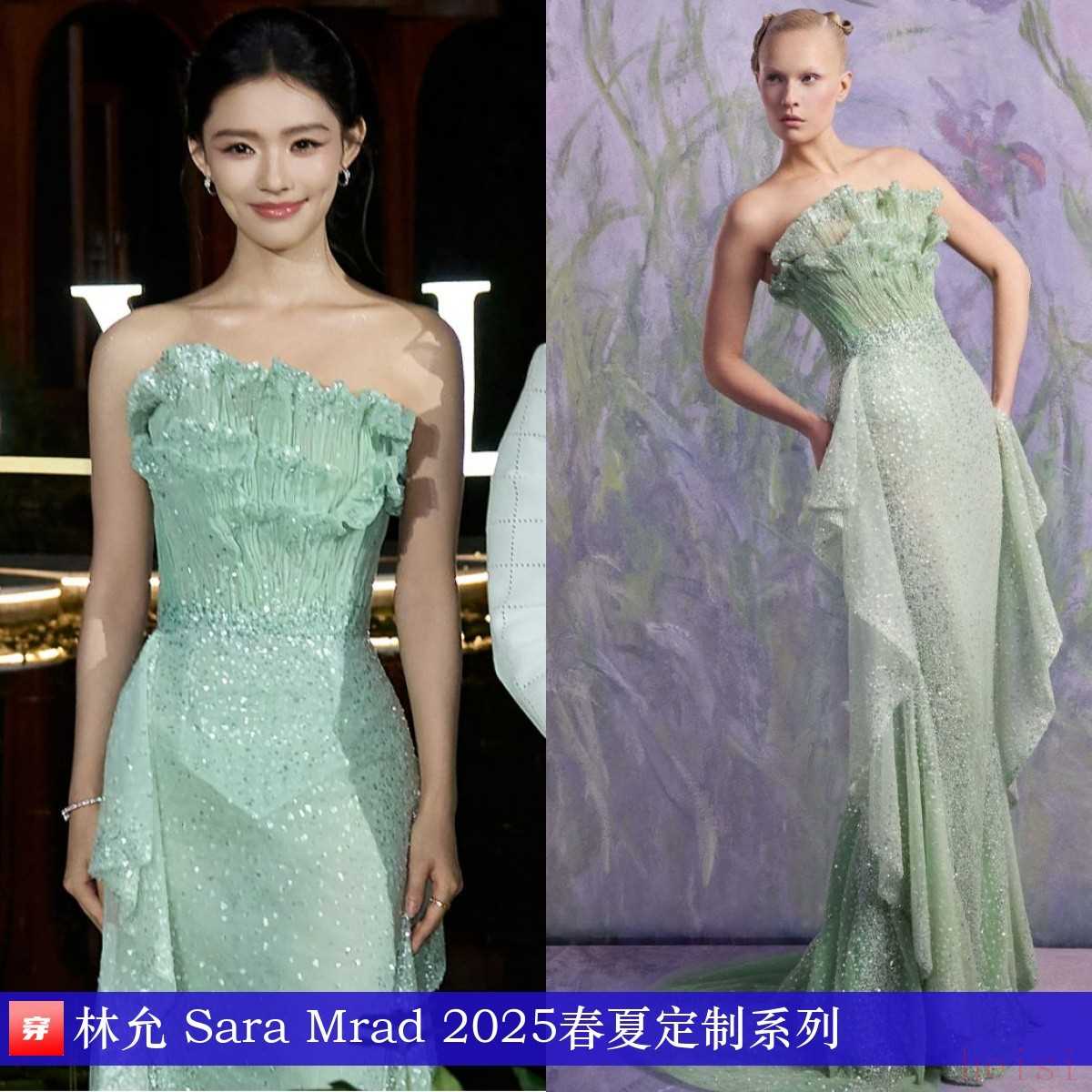 林允身穿Sara Mrad 2025春夏定制系列綠色皺褶荷葉邊閃鉆抹胸禮服參加在成都舉行的某品牌晚宴。
